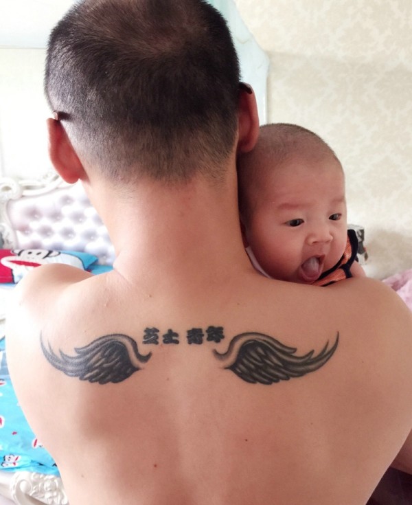 80后男士后背个性图腾纹身展示父爱