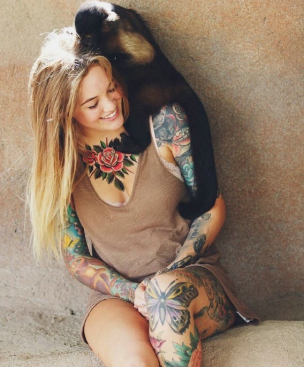 欧美女生和动物亲密接触非常开心的个性纹身