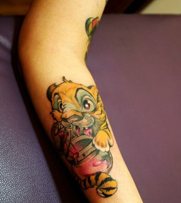 手臂有着非常可爱好玩的小老虎纹身