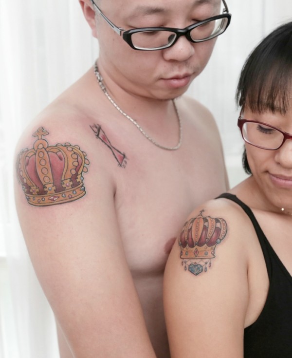 非常默契的情侣大臂彩色皇冠纹身