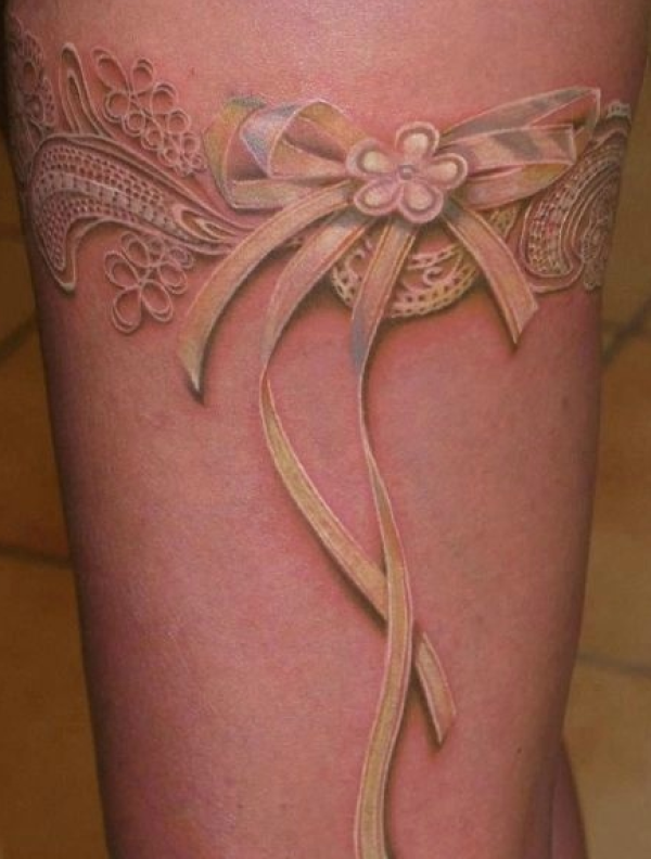 大腿上3D蕾丝蝴蝶结纹身
