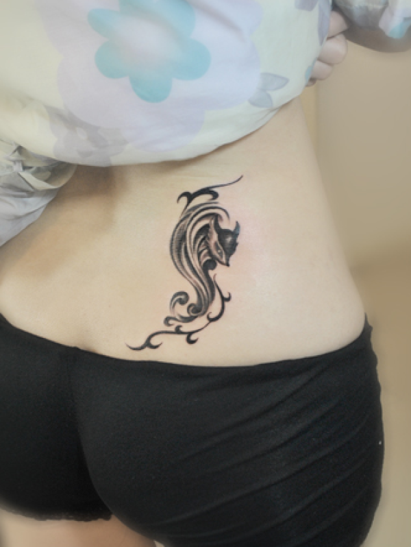 女生后腰纹身黑白灰风格抽象线条纹身图案