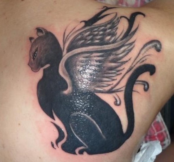 背部可爱带翅膀的喵星人纹身