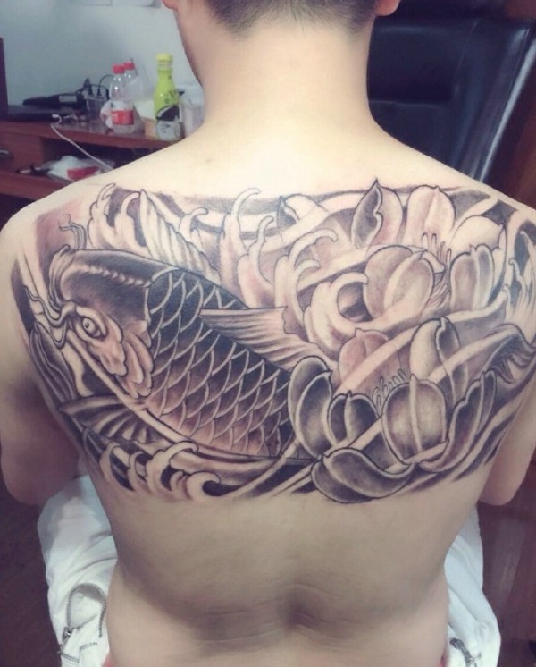 遮盖着半个背部的大鲤鱼和杜丹花纹身