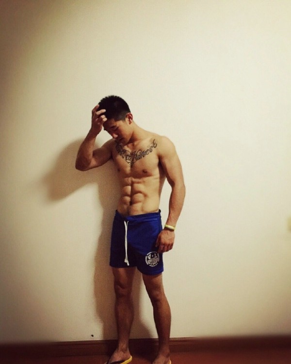 健身肌肉男胸前独特的英文纹身