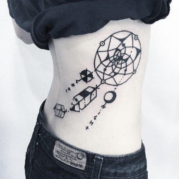 女生后腰纹身黑白灰风格抽象线条纹身图案