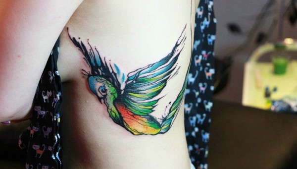 飞落在女生肌肤上的五彩小鸟个性图案纹身
