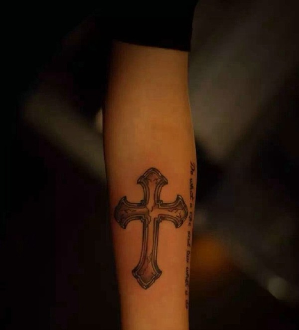 个性简单十字架和英文结合的手臂纹身