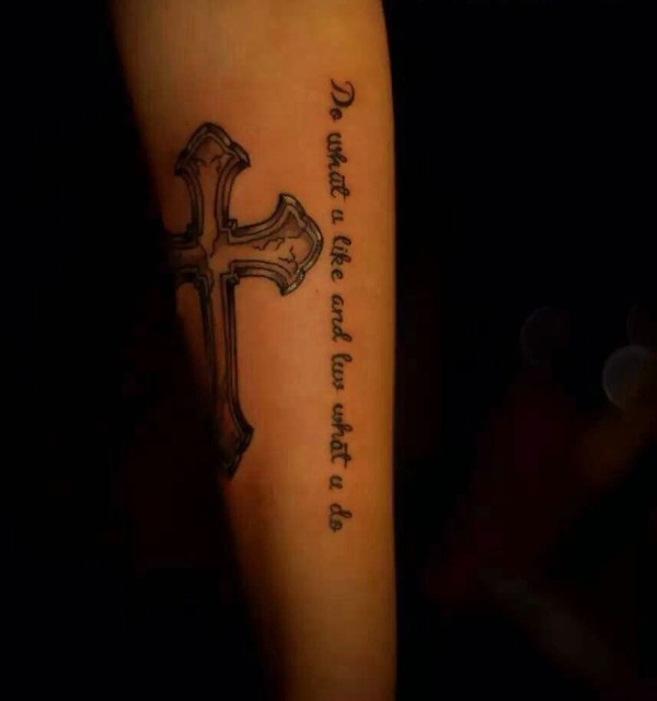 个性简单十字架和英文结合的手臂纹身