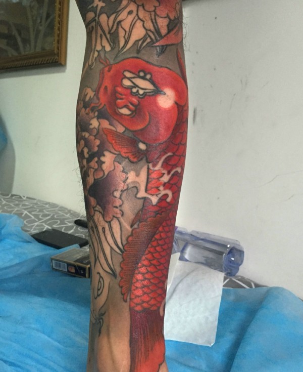 传统鲤鱼花小腿纹身_腿部纹身图案大全_纹身图吧