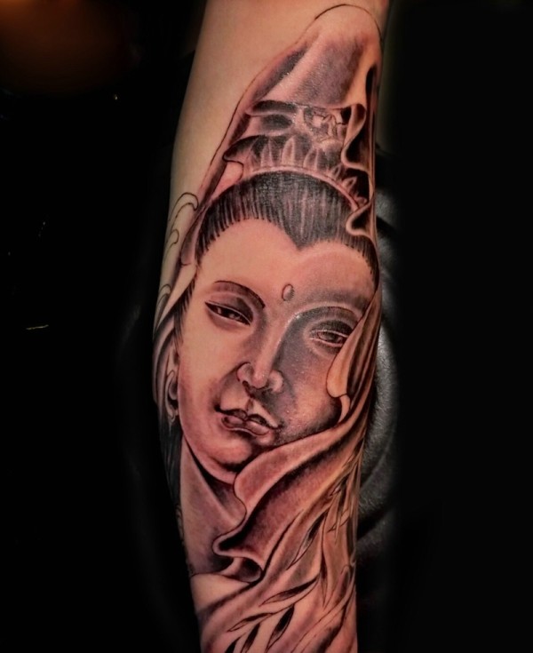 手臂上有着好看的黑白观音纹身