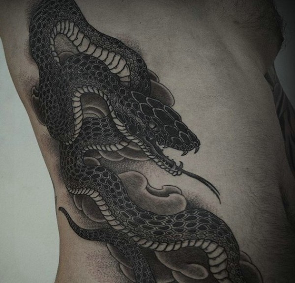 侧腰部的个性黑白蛇图案纹身