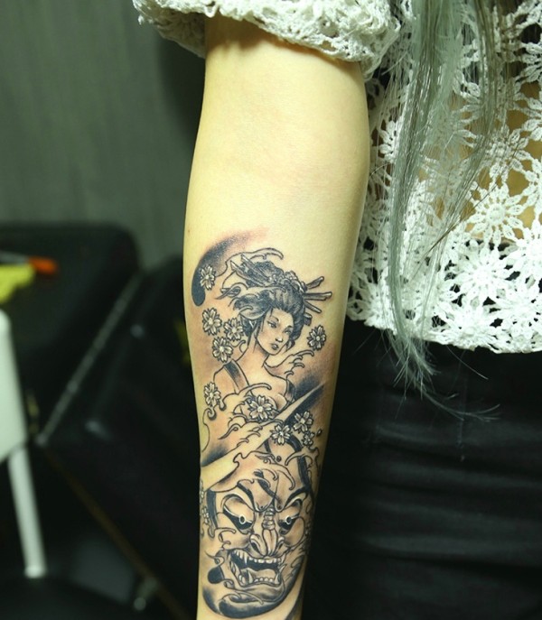 手臂一枚古代美女和小般若结合纹身