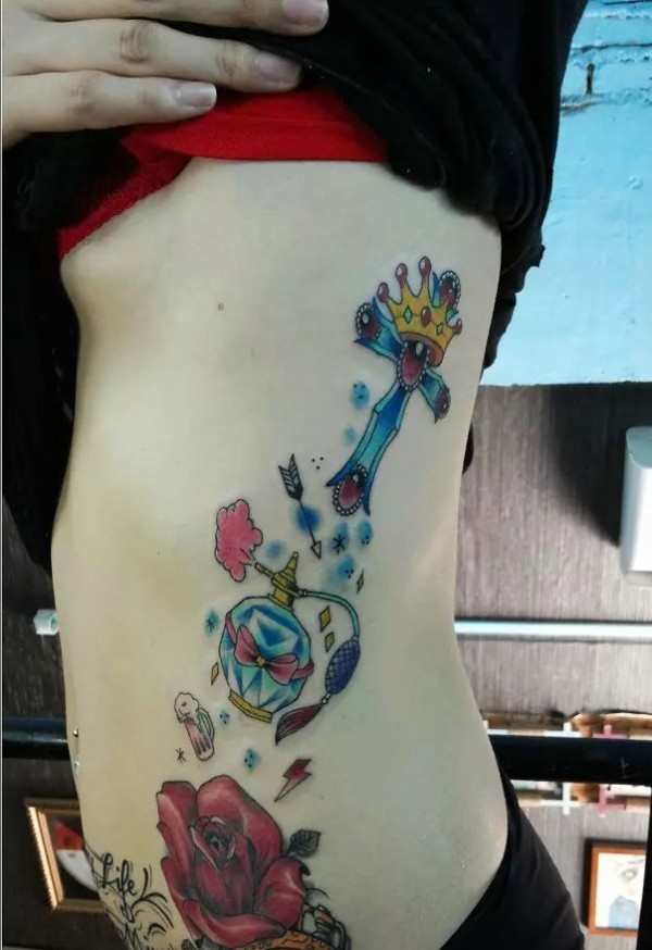 细腰美女侧腰部的彩色图腾纹身女性味十足