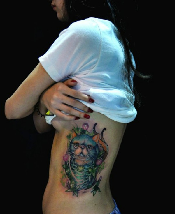 女生侧腰部有着萌萌可爱的小花猫纹身