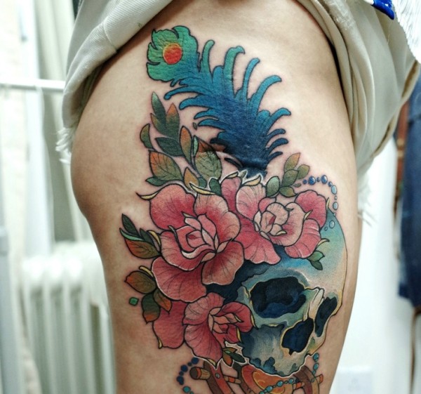非常亮眼的彩色花朵和骷髅一起的腿部纹身