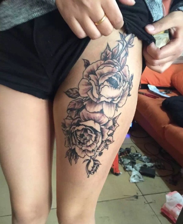 女生大腿落着两朵黑白花朵纹身