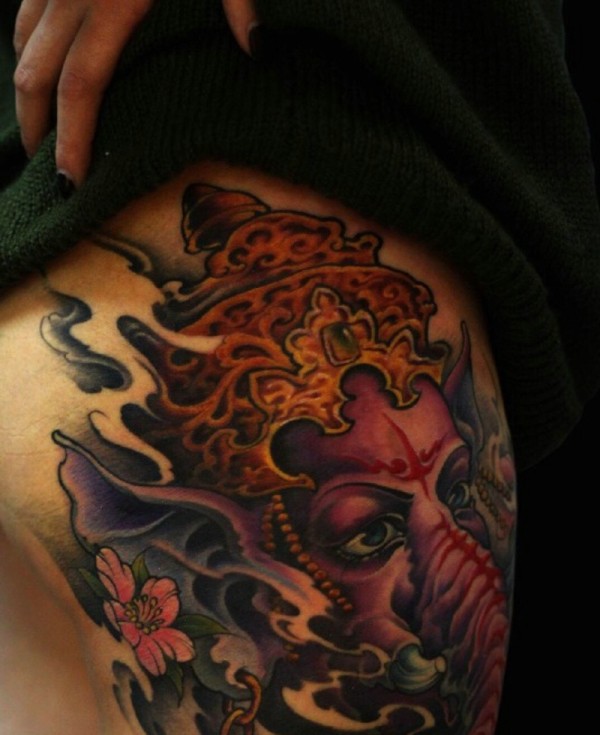 大腿部彩色象神纹身相当亮眼
