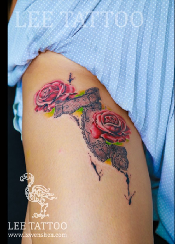 女孩玫瑰花蕾丝纹身