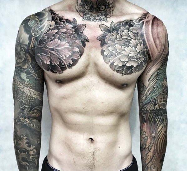 魅力男士有着酷呆的双半甲纹身