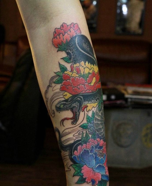 藏在花丛中的一条饥饿小蛇的个性纹身
