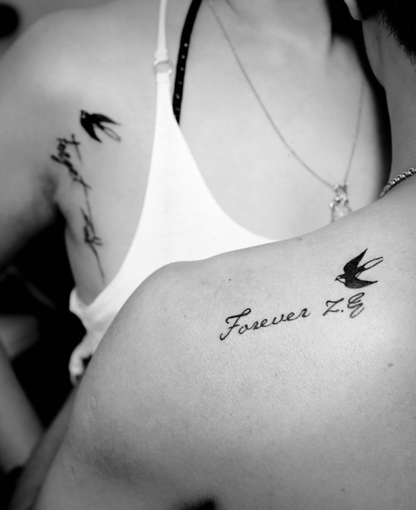 落在肩膀上的简单小英文情侣纹身