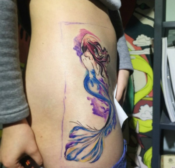 侧腰部的漂亮美人鱼纹身美美的