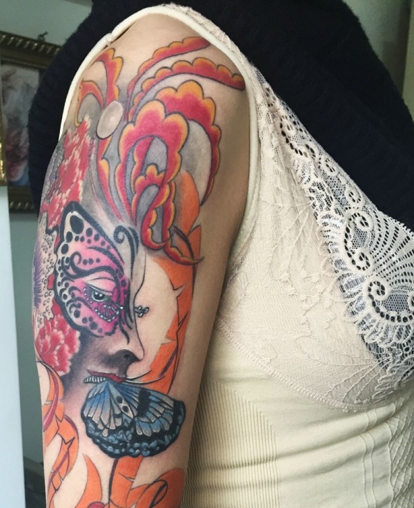 漂亮的美女肖像和蝴蝶结合的手臂纹身