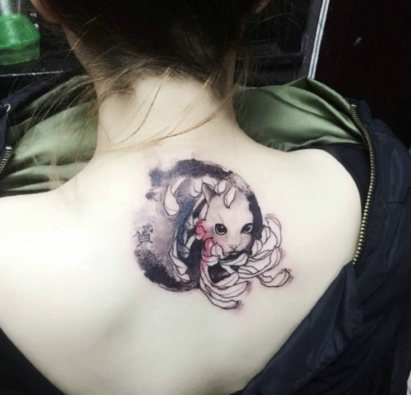皙白的后背有着非常可爱的动物纹身