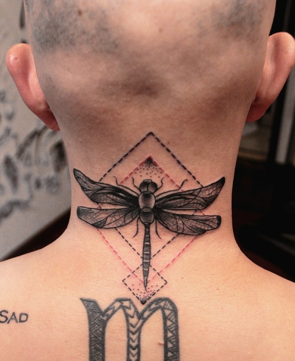 另类男士颈部小蜻蜓纹身一枚