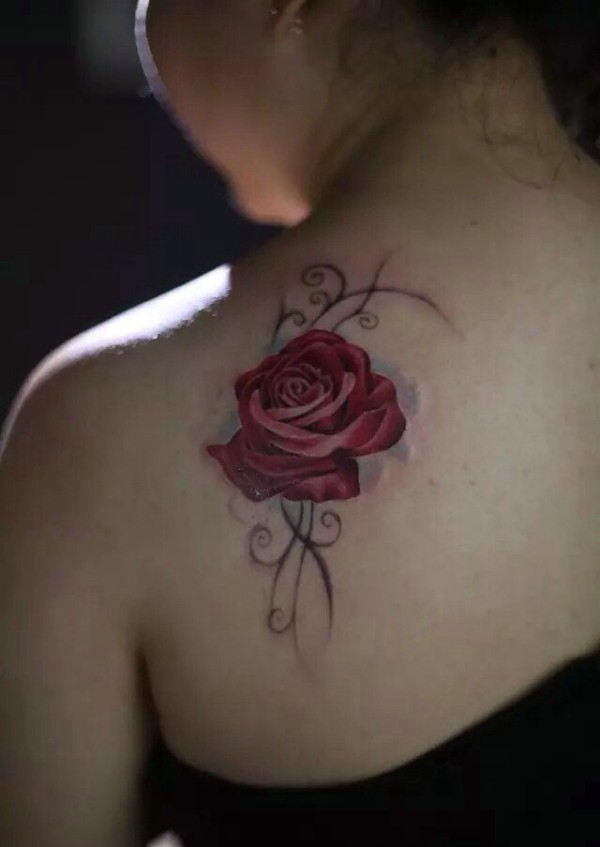 性感的香肩配着一朵红玫瑰纹身