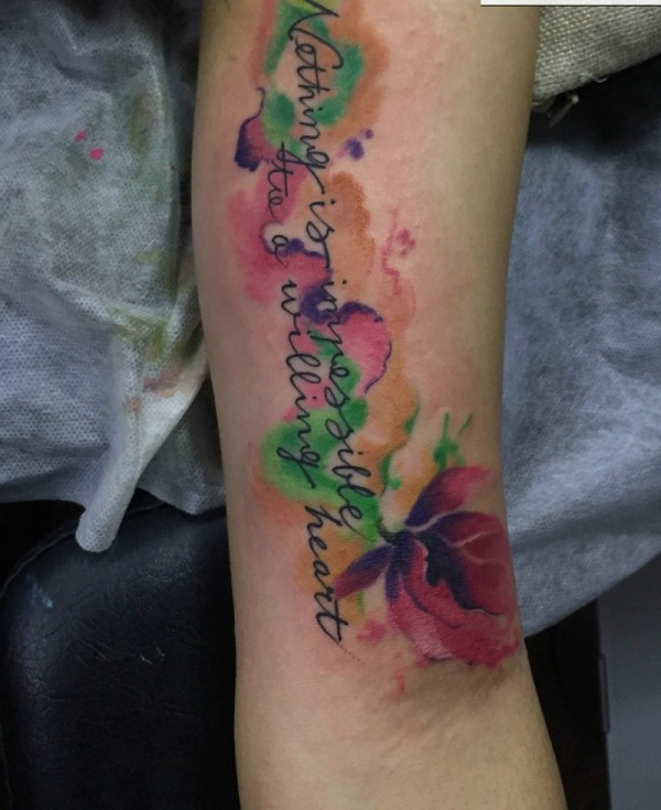 五颜六色的花朵配着英文手臂纹身