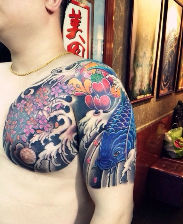 简直亮瞎眼的彩色半甲鲤鱼纹身