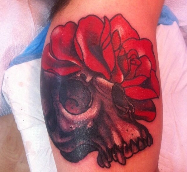 女生手臂经典潮流的骷髅与玫瑰花纹身图案