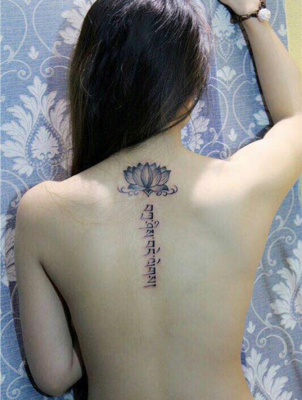 女生脊椎部荷花和梵文结合的纹身