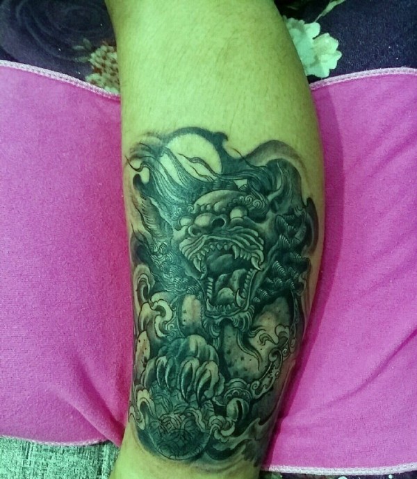 处在腿部霸气抢眼的貔貅纹身