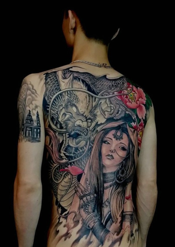 邪龙与美女结合的满背另类图腾纹身