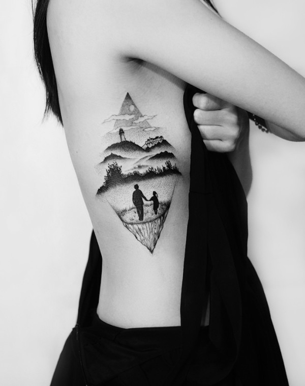 女生后腰纹身黑白灰风格抽象线条纹身图案