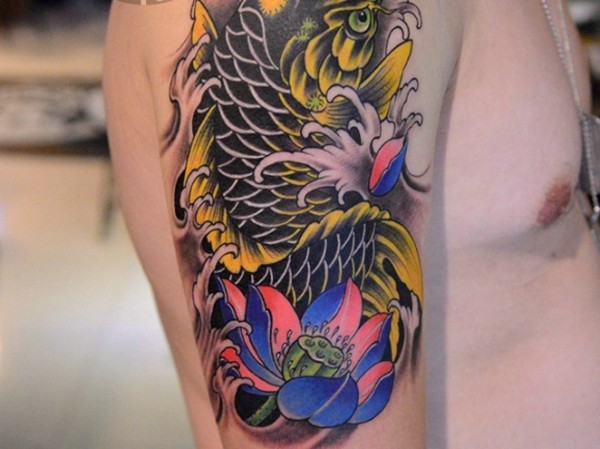 大臂上的金色小鲤鱼纹身