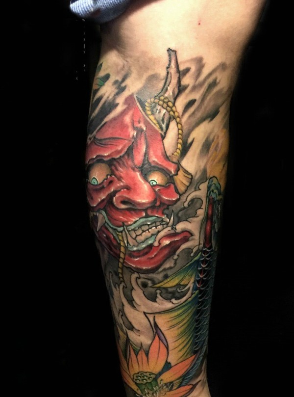 小腿部的红般若纹身很抢眼