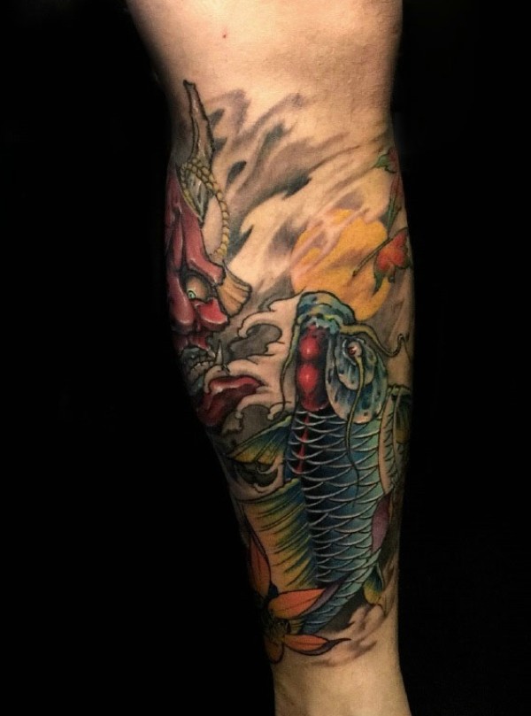 传统鲤鱼花小腿纹身_腿部纹身图案大全_纹身图吧