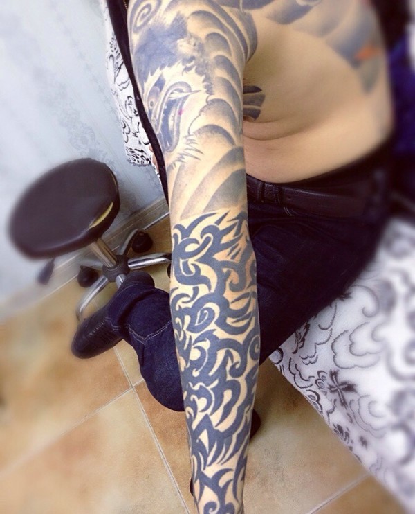 手臂黑白图腾纹身让人陶醉