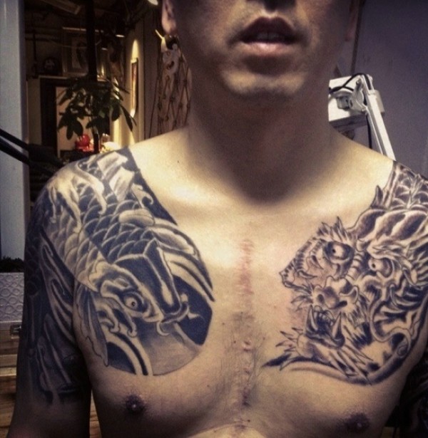 左边鲤鱼右边邪龙的个性双半甲纹身