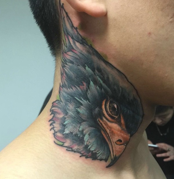 男人脖子彩色燕子刺青图案图片_脖子纹身图案大全_纹身图吧