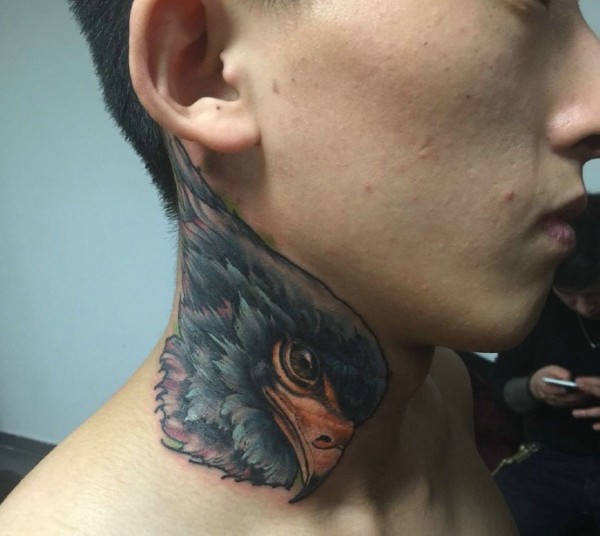 男人脖子彩色燕子刺青图案图片_脖子纹身图案大全_纹身图吧