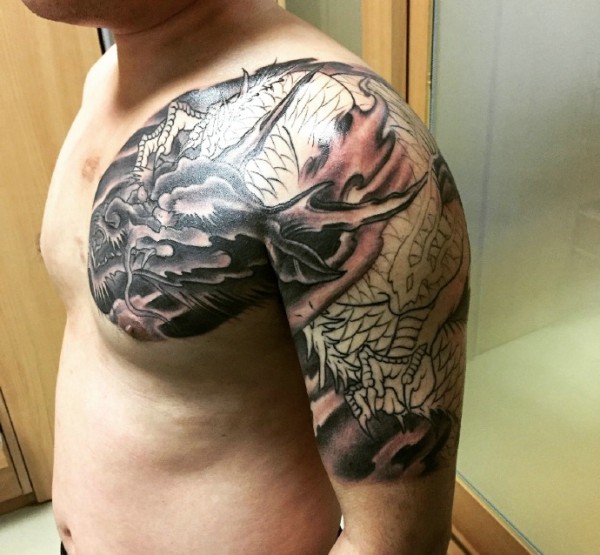 男士黑白邪龙半甲纹身图片