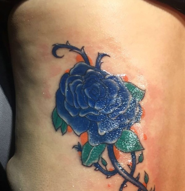 一朵蓝玫瑰侧腰部纹身图片很抢眼