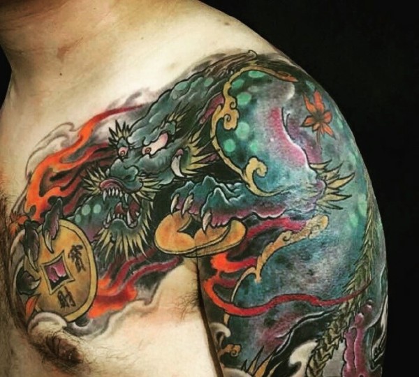 吊炸天的彩色半甲麒麟纹身图片