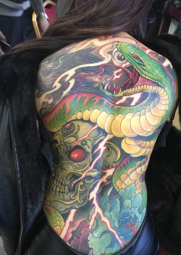 大胆女生满背一条蛇彩色纹身图案