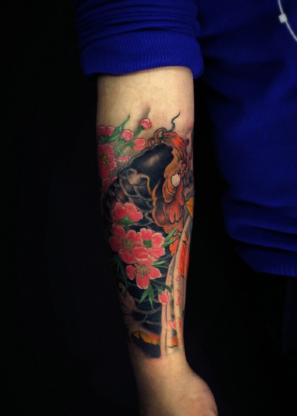 小臂惊艳动人的彩色鲤鱼纹身图案
